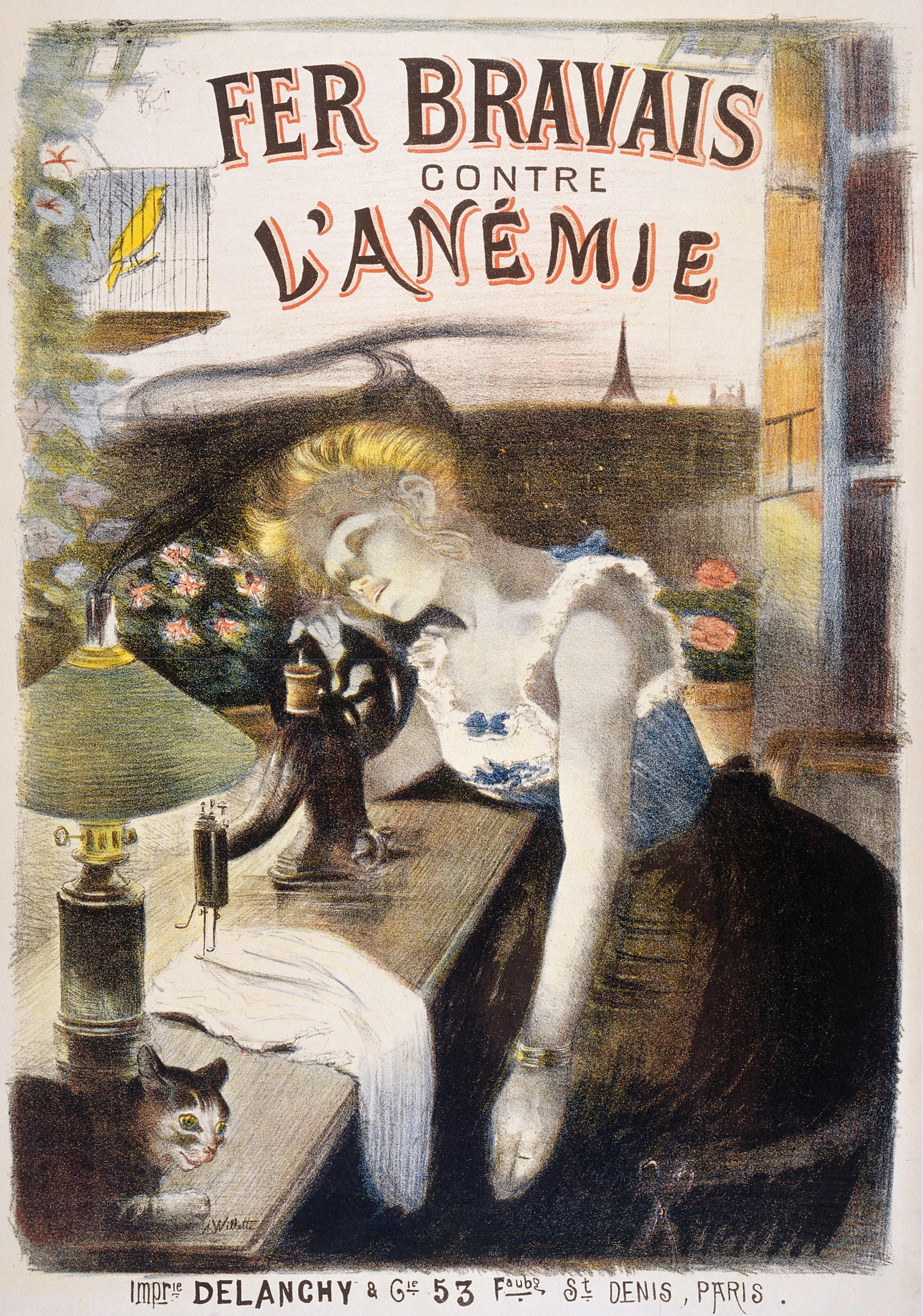 Pictured: A Parisian seamstress suffering from anemia is pale and weary at her sewing machine and drops her scissors; advertising the medicine Fer Bravais for anemia. Color lithograph by A.-L. Willette, 1896.